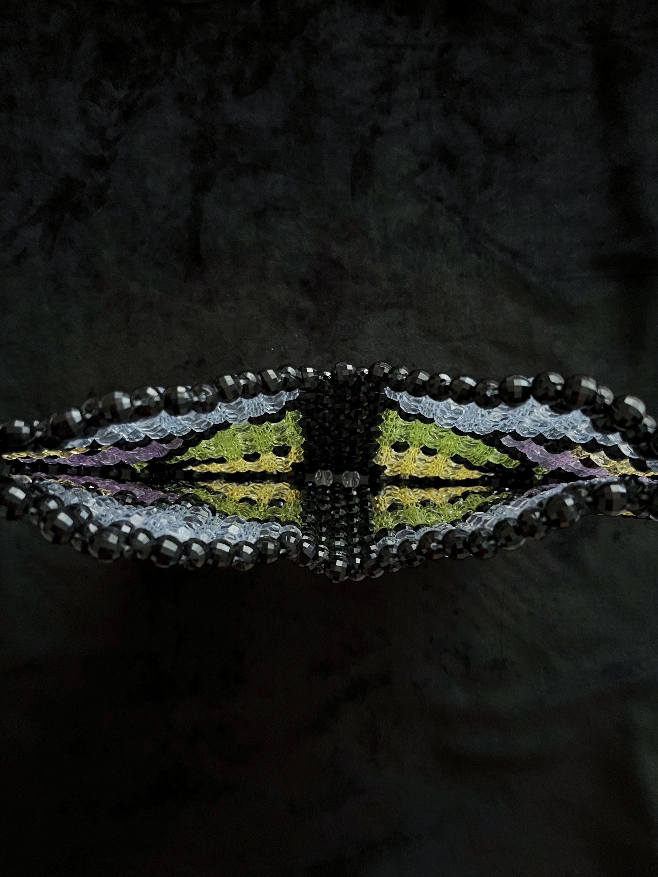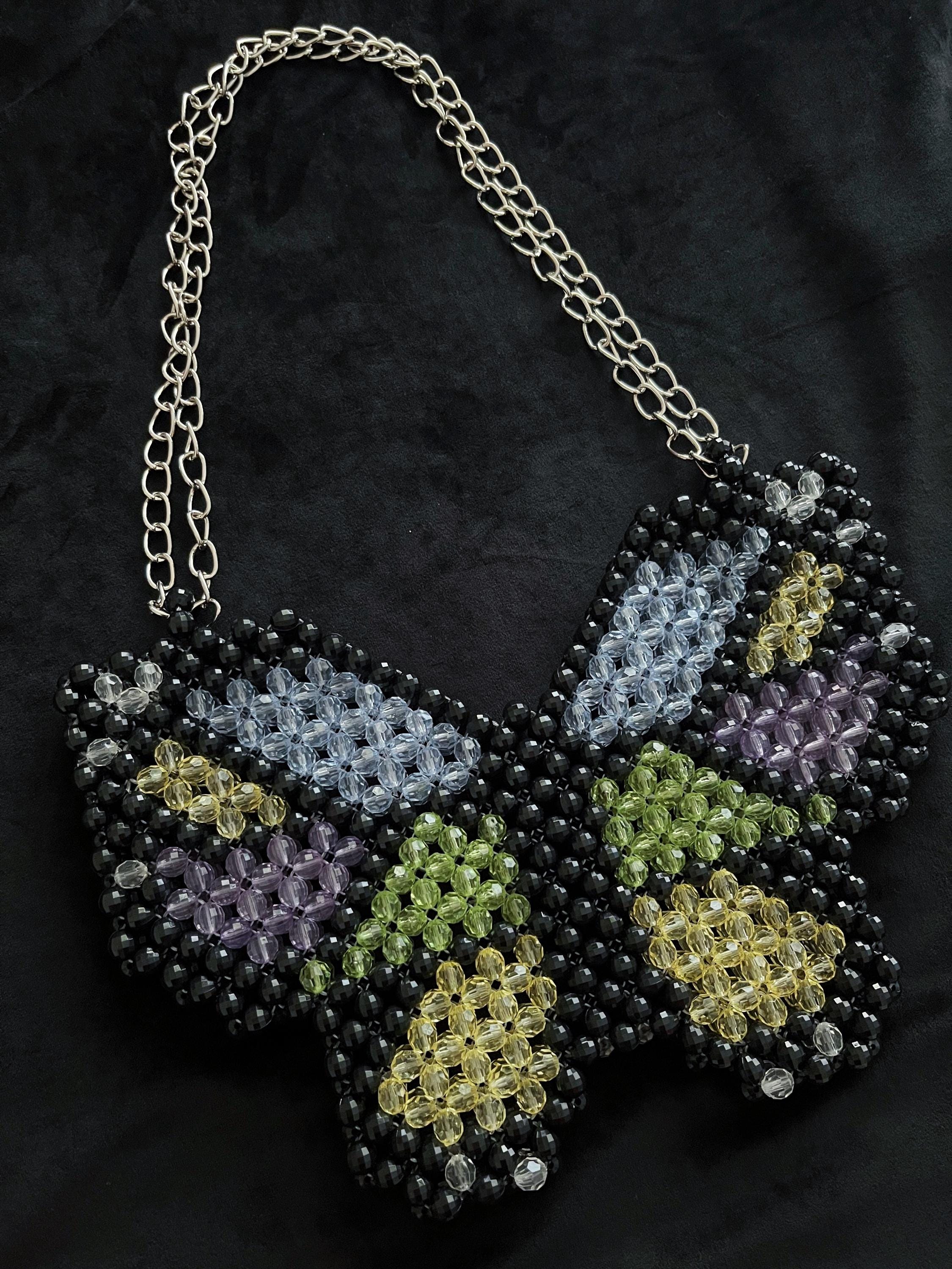 Product DescriptionThis handmade beaded shoulder bag features a butterfly-shaped silhouette with black bead outlining and pastel wing details for a whimsical yet stylish look. Unique and eye-catching, it is perfect for parties, dates, vacations, festivals, and statement daily styling. DetailsBag Size: Approx. 9.1 x 5.9 in / 23 x 15 cmChain Strap Drop: Approx. 8.3 in / 21 cmMaterial: Beaded construction, metal chain strap Selling PointsButterfly shape creates a playful statement lookPastel color blocks add a sweet artistic touchHandmade beaded design with glossy textureGreat for parties, outings, and fashion-forward outfits