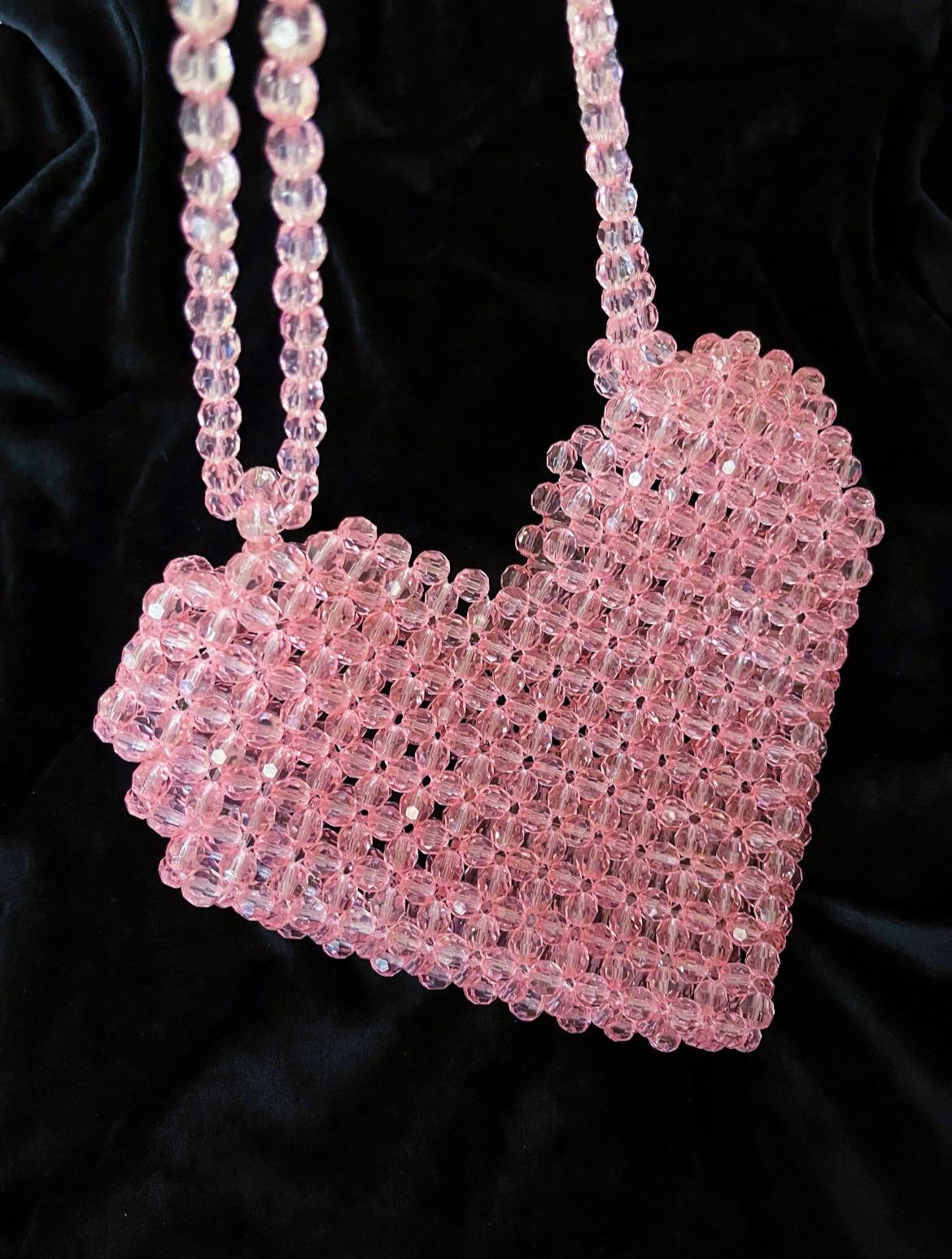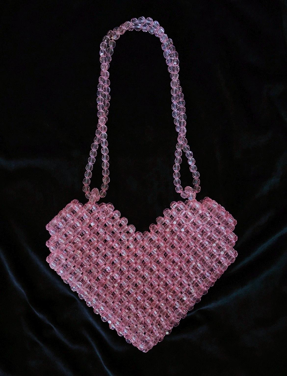 Product DescriptionThis handmade beaded shoulder bag features a transparent pink heart-shaped design for a sweet, romantic, and eye-catching look. Glossy and feminine, it is perfect for parties, dates, weddings, vacations, and charming everyday styling. DetailsBag Size: Approx. 8.7 x 7.9 in / 22 x 20 cmHandle Drop: Approx. 8.3 in / 21 cmMaterial: Beaded construction Selling PointsHeart-shaped silhouette with a lovely statement lookTransparent pink beads create a glossy finishHandmade design with a delicate feminine feelGreat for parties, outings, and cute daily outfits